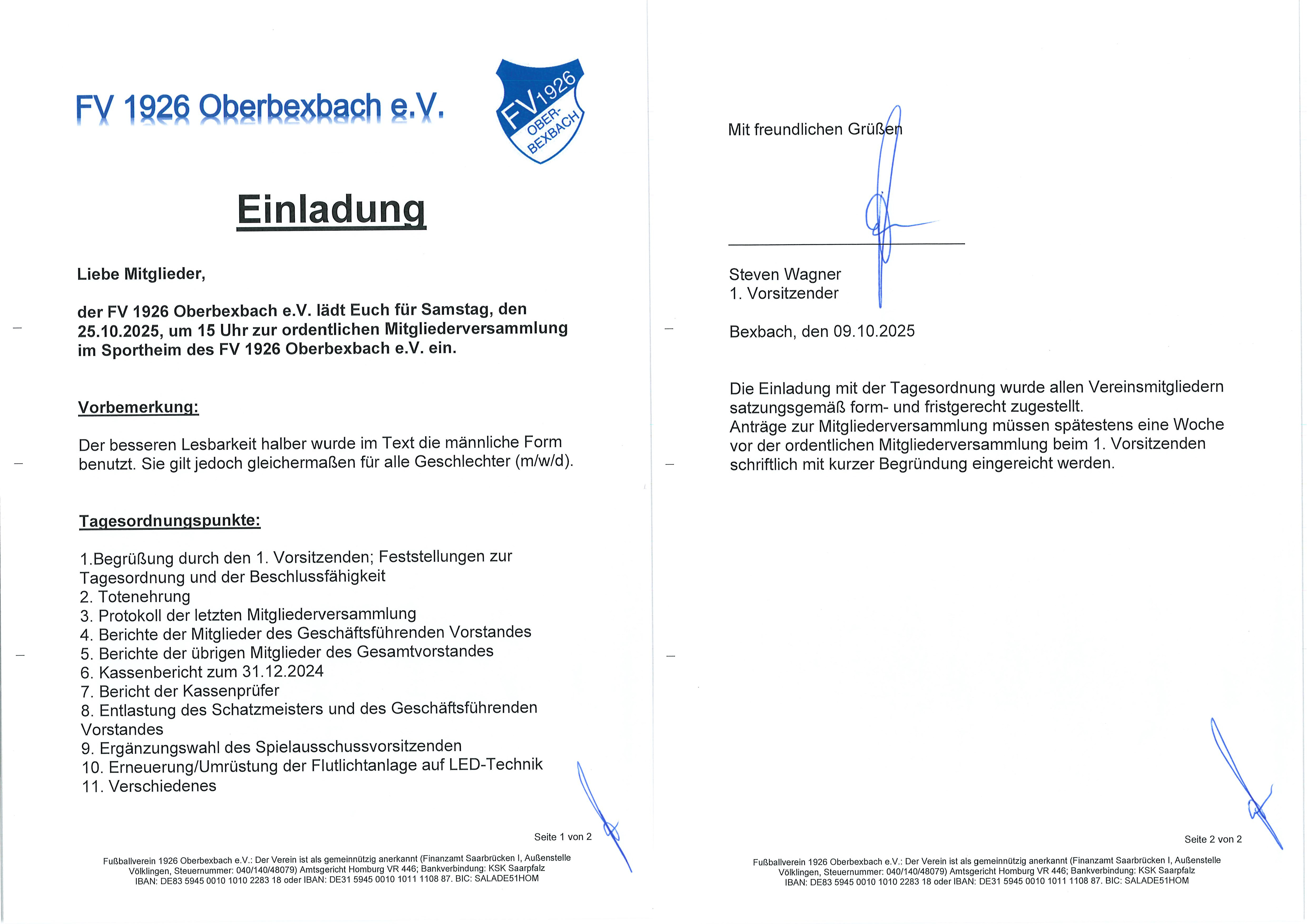 wir laden Euch herzlich zu unserer diesjährigen Mitgliederversammlung ein. Gemeinsam blicken wir auf das Vereinsjahr, geben einen Ausblick und besprechen die nächsten Schritte für unseren blau‑weißen Weg. Deine Stimme zählt – gestalte den FVO aktiv mit!