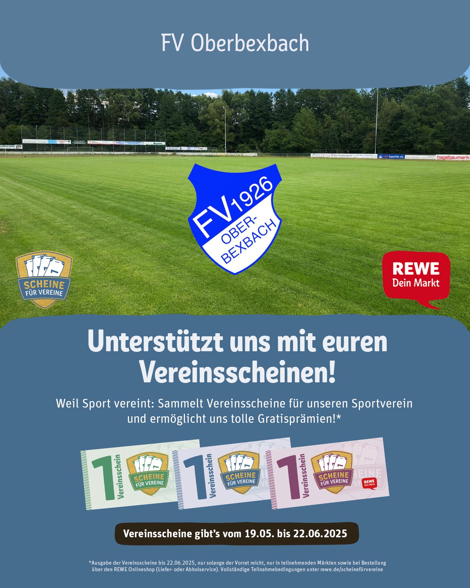 Auch in diesem Jahr nimmt der FV Oberbexbach wieder an der Aktion Scheine für Vereine teil. Ab Montag bekommt ihr in allen teilnehmenden REWE Filialen einen Vereinsschein pro 15 € Einkaufswert. Mit diesen Scheinen könnt ihr den FV Oberbexbach kostenlos unterstützen. Denn von den Scheinen können wir uns attraktive Prämien sichern und das auch komplett kostenfrei.
