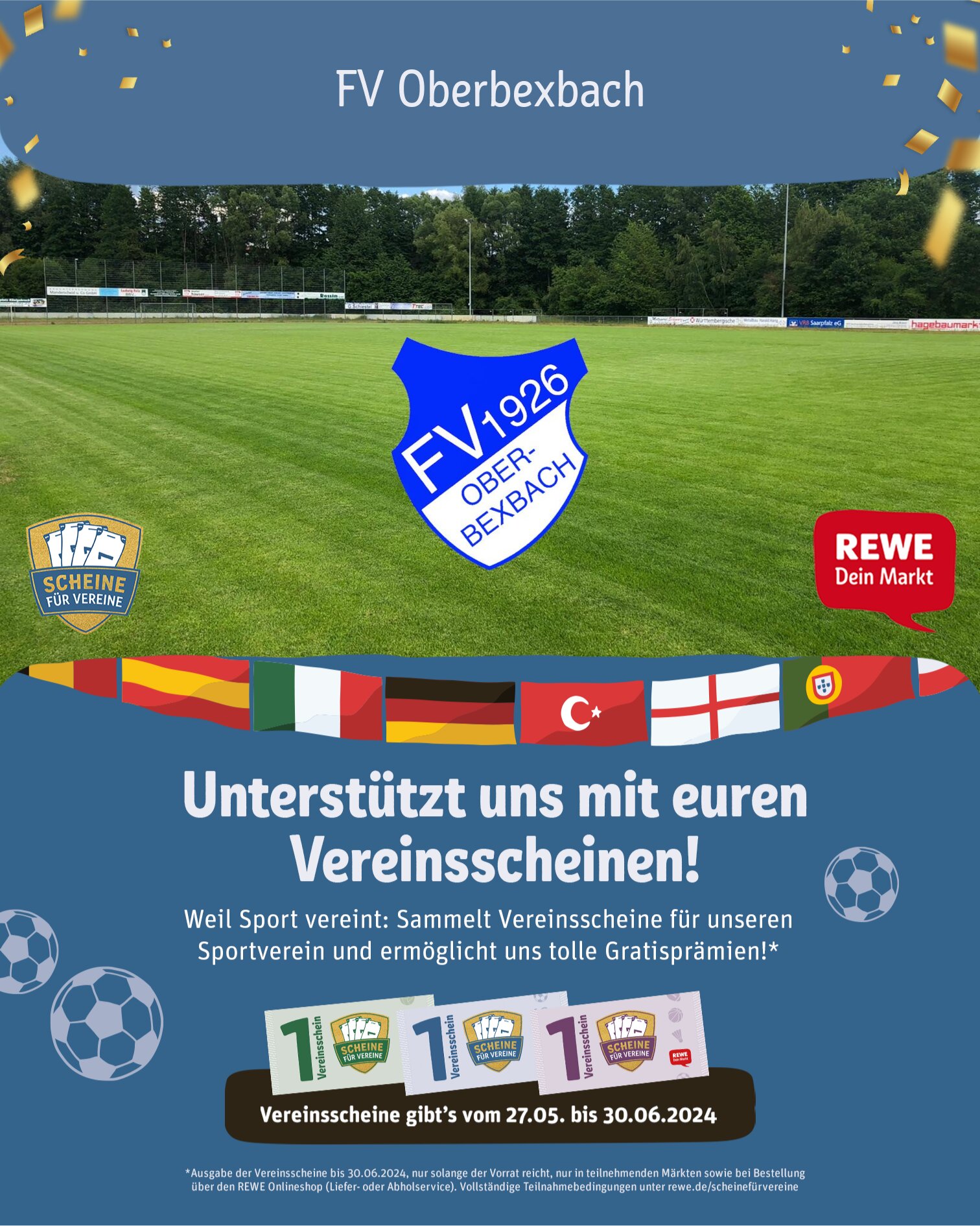 Scheine für Vereine geht in die nächste Runde und der FV Oberbexbach ist wieder dabei! Ab dem 27.05 erhaltet Ihr bei einem Einkauf in einer REWE Filiale einen Vereinsschein pro 15 € Einkaufswert, mit dem Ihr uns gratis unterstützen könnt. Diese könnt Ihr dann entweder im REWE Markt Bexbach in unsere Box werfen oder Ihr scannt den QR-Code direkt selbst ein. Also seid dabei und unterstützt uns komplett kostenlos! Denn von den Vereinsscheinen kann sich der FV Oberbexbach ebenfalls kostenlos tolle Prämien sichern.💪🏼🔵⚪