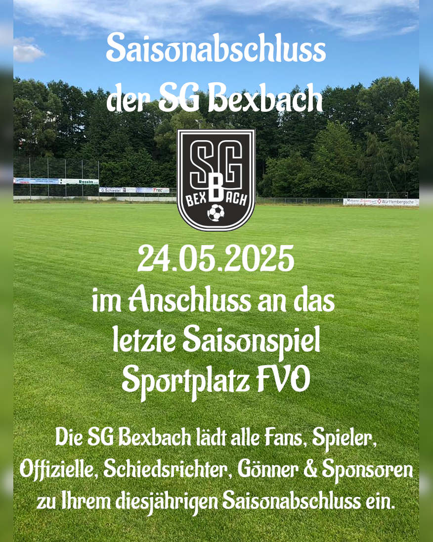 Im Anschluss an die beiden letzten Saisonspiele am Samstag findet der diesjährige Saisonabschluss der SG Bexbach statt, zu dem all Spieler, treuen Fans, Offizielle, Schiedsrichter, Gönner & Sponsoren recht herzlich eingeladen sind.